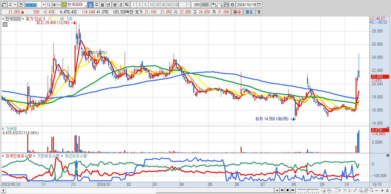 - 한국파마 (21,050원 ▲ 2.43% , 시총: 2,296억, 거래량: 4,479,432, 거래대금:1,035억)