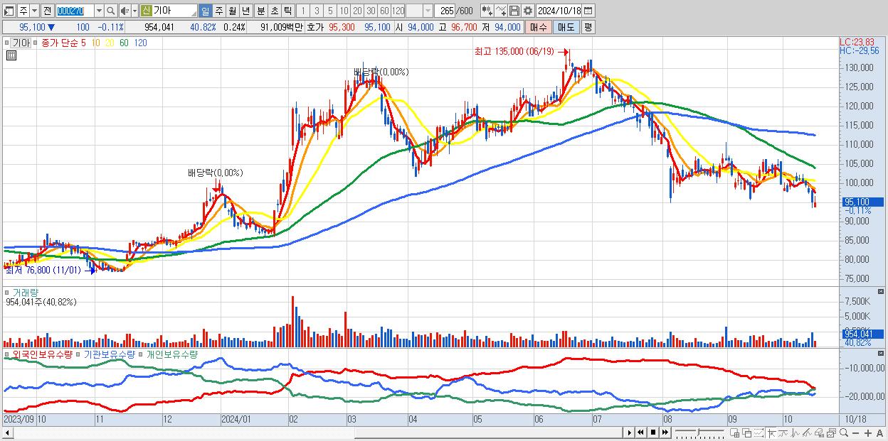 - 기아 (95,100원 ▼ -0.11% , 시총: 380,265억, 거래량: 954,041, 거래대금:910억)