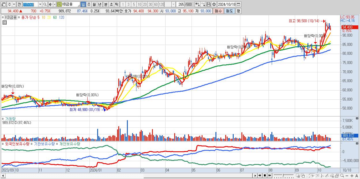 - KB금융 (94,400원 ▲ 0.75% , 시총: 371,491억, 거래량: 989,872, 거래대금:936억)