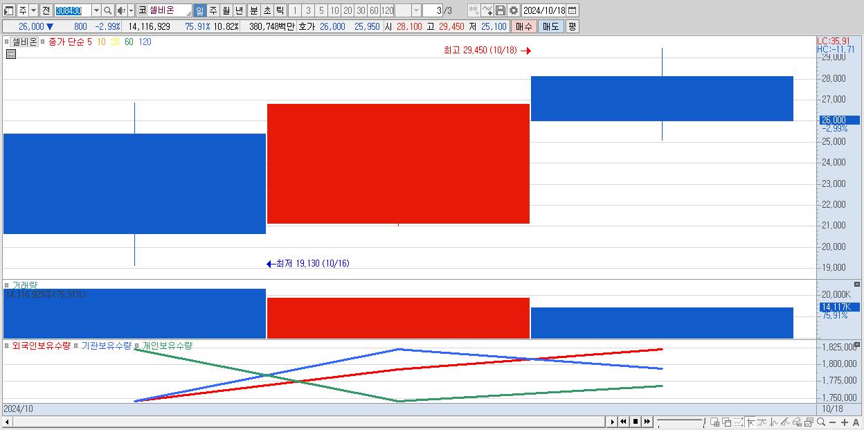 - 셀비온 (26,000원 ▼ -2.99% , 시총: 3,312억, 거래량: 14,116,929, 거래대금:3,807억)