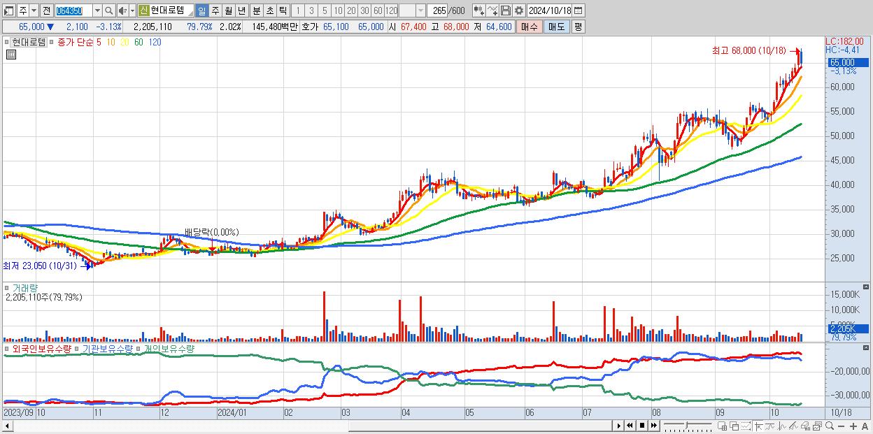 - 현대로템 (65,000원 ▼ -3.13% , 시총: 70,942억, 거래량: 2,205,110, 거래대금:1,455억)