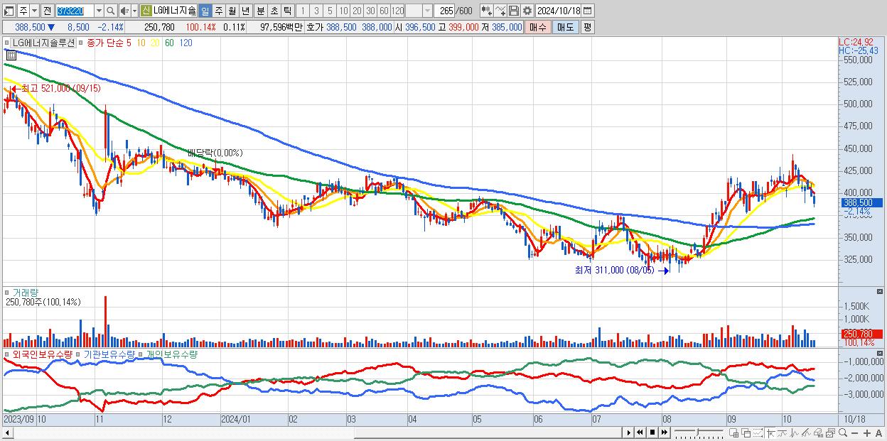 - LG에너지솔루션 (388,500원 ▼ -2.14% , 시총: 909,090억, 거래량: 250,780, 거래대금:976억)