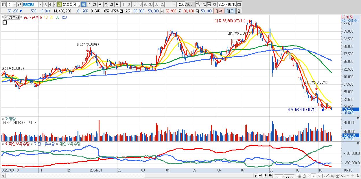 - 삼성전자 (59,200원 ▼ -0.84% , 시총: 3,534,111억, 거래량: 14,420,260, 거래대금:8,574억)