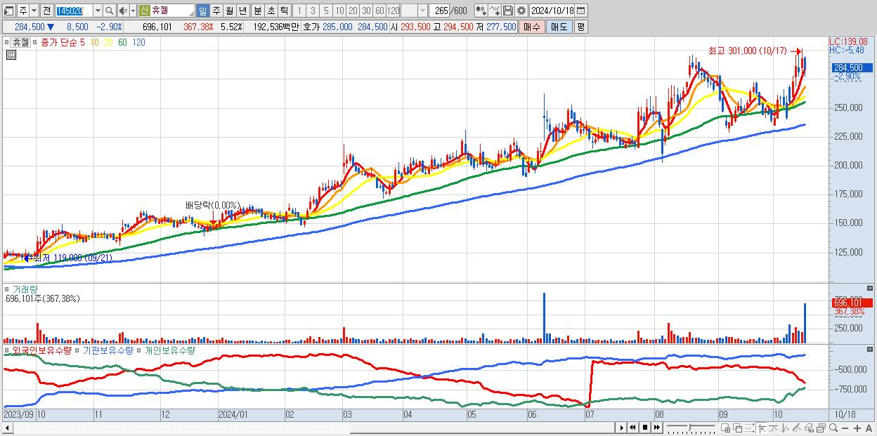 - 휴젤 (284,500원 ▼ -2.9% , 시총: 35,858억, 거래량: 696,101, 거래대금:1,925억)