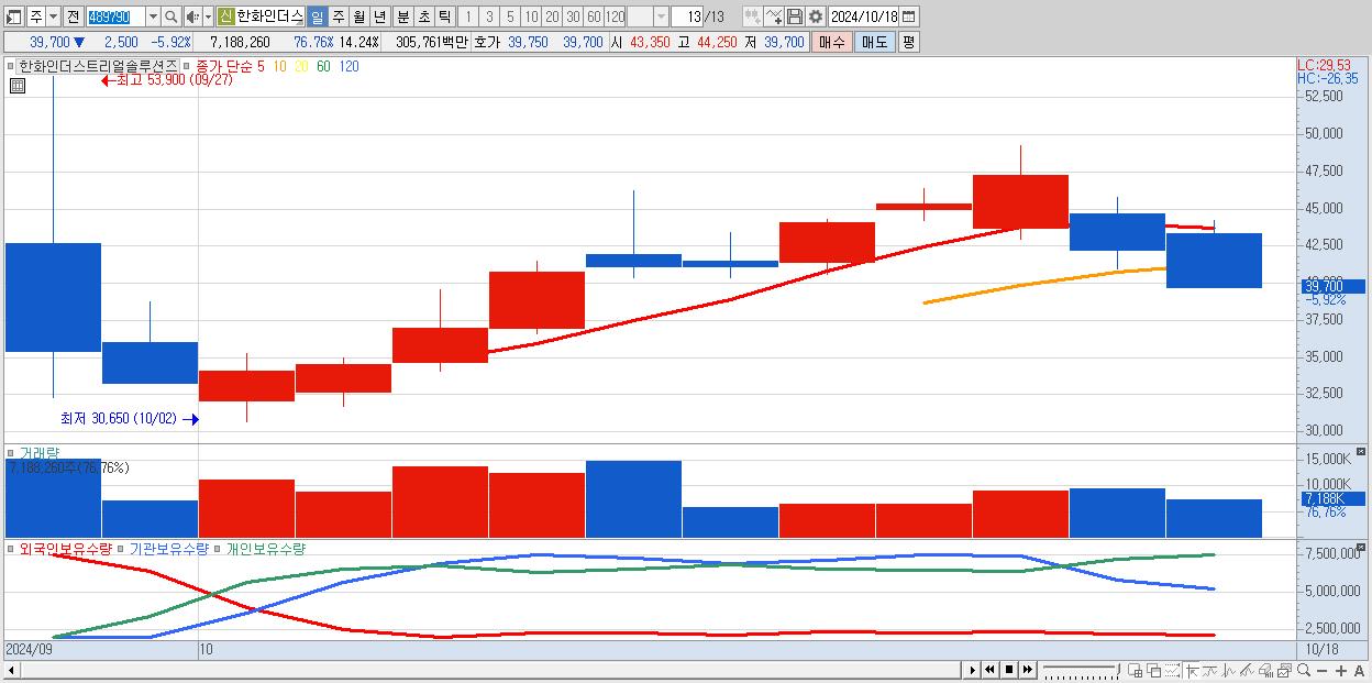 - 한화인더스트리얼솔루션즈 (39,700원 ▼ -5.92% , 시총: 20,044억, 거래량: 7,188,260, 거래대금:3,058억)