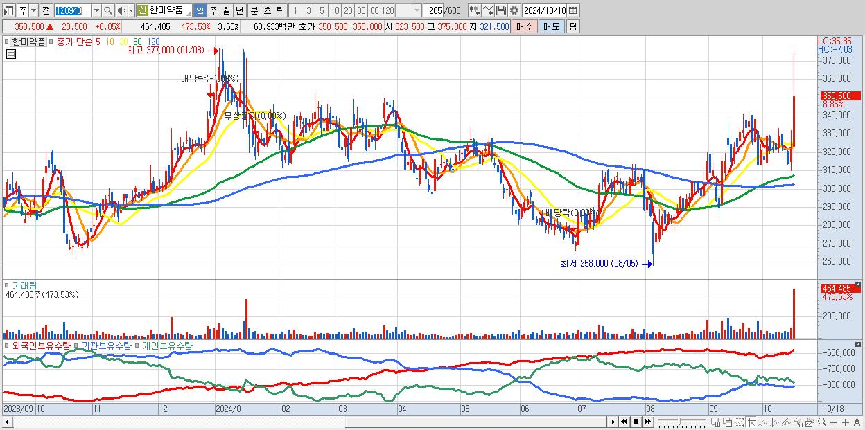 - 한미약품 (350,500원 ▲ 8.85% , 시총: 44,903억, 거래량: 464,485, 거래대금:1,639억)