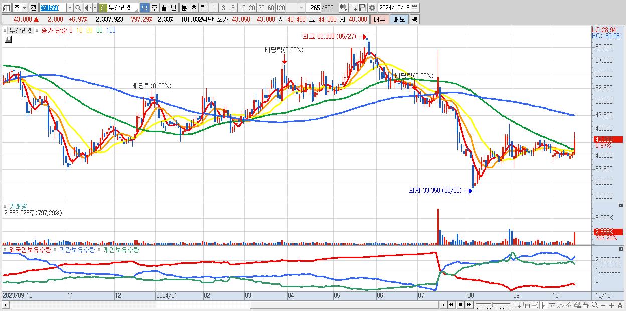 - 두산밥캣 (43,000원 ▲ 6.97% , 시총: 43,107억, 거래량: 2,337,923, 거래대금:1,010억)