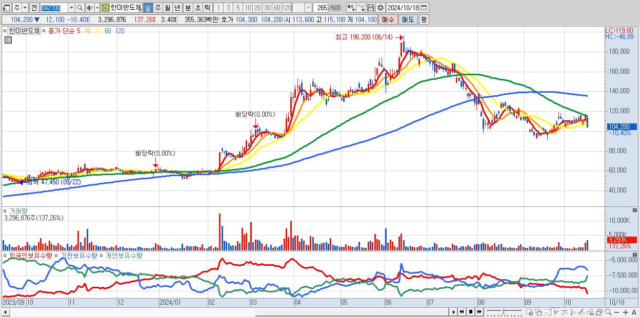 - 한미반도체 (104,200원 ▼ -10.4% , 시총: 101,067억, 거래량: 3,296,876, 거래대금:3,554억)