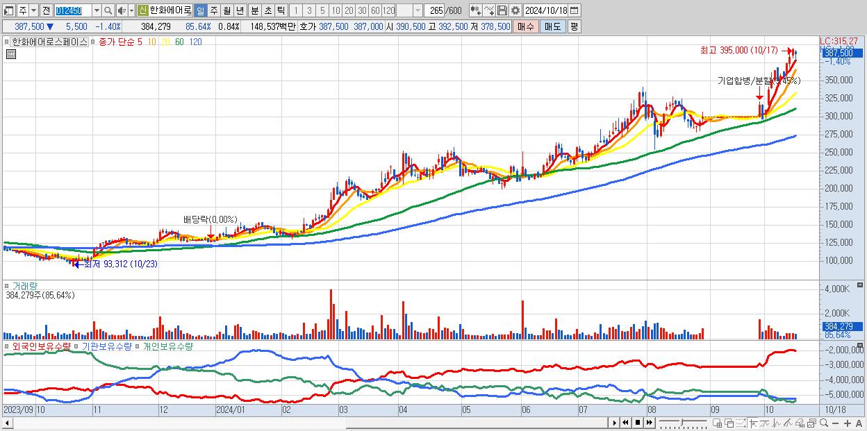 - 한화에어로스페이스 (387,500원 ▼ -1.4% , 시총: 176,627억, 거래량: 384,279, 거래대금:1,485억)