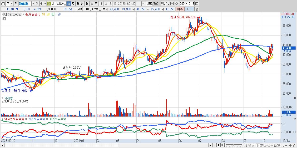- 이수페타시스 (43,400원 ▼ -4.82% , 시총: 27,449억, 거래량: 2,338,005, 거래대금:1,034억)