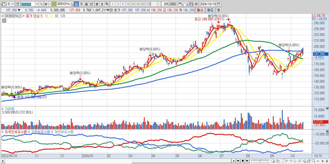 - SK하이닉스 (187,300원 ▼ -4.44% , 시총: 1,363,548억, 거래량: 5,509,895, 거래대금:10,472억)