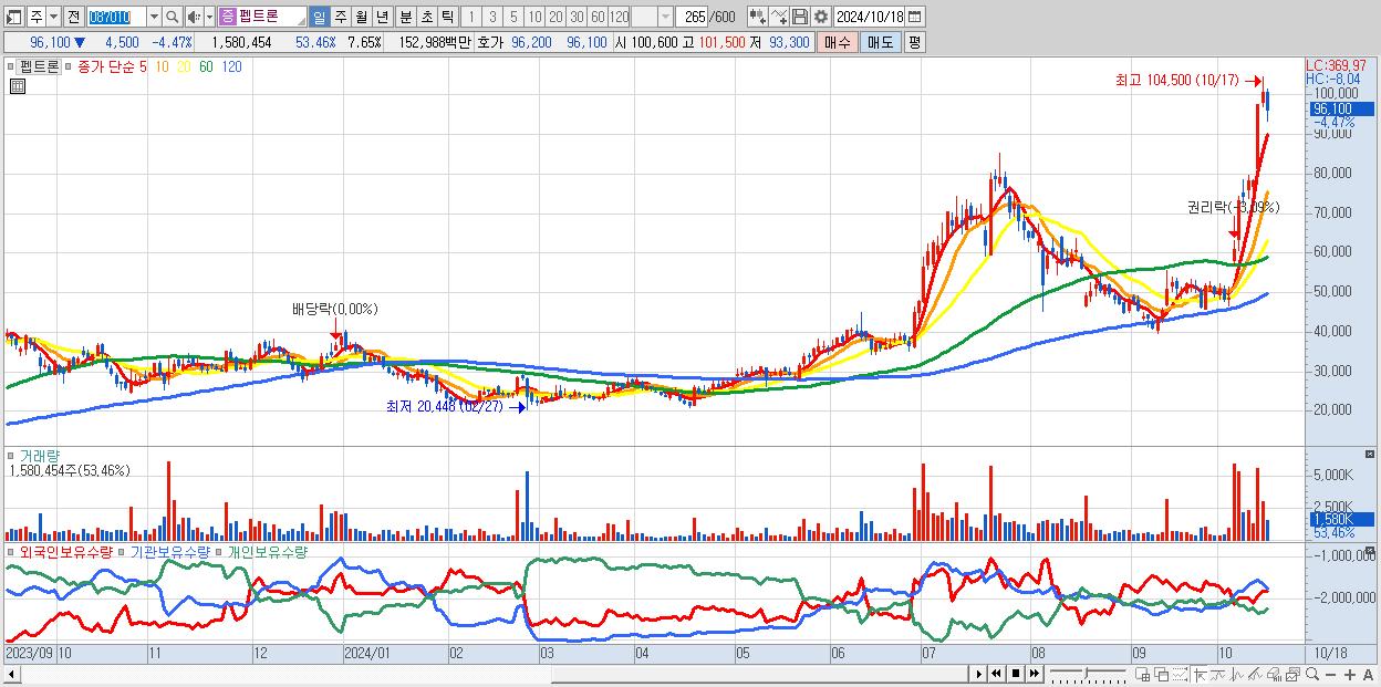 - 펩트론 (96,100원 ▼ -4.47% , 시총: 19,852억, 거래량: 1,580,454, 거래대금:1,530억)
