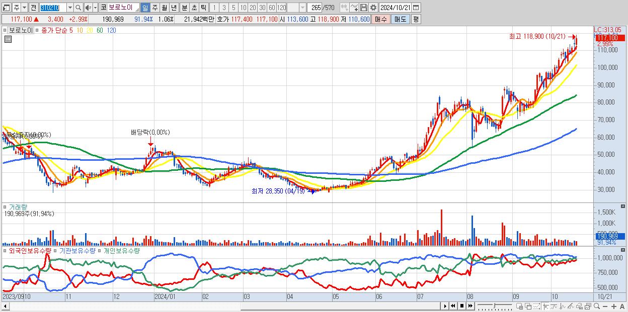 - 보로노이 (117,100원 ▲ 2.99% , 시총: 21,188억, 거래량: 190,969, 거래대금:219억, KOSDAQ)