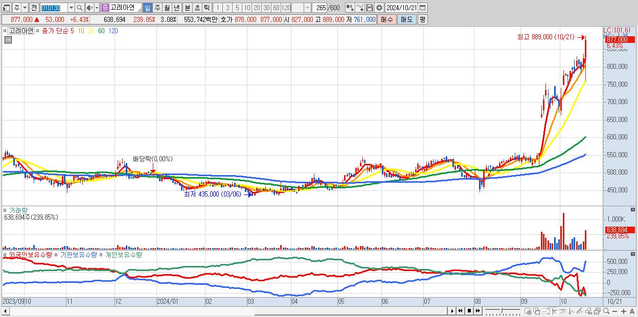 - 고려아연 (877,000원 ▲ 6.43% , 시총: 181,568억, 거래량: 638,694, 거래대금:5,537억)