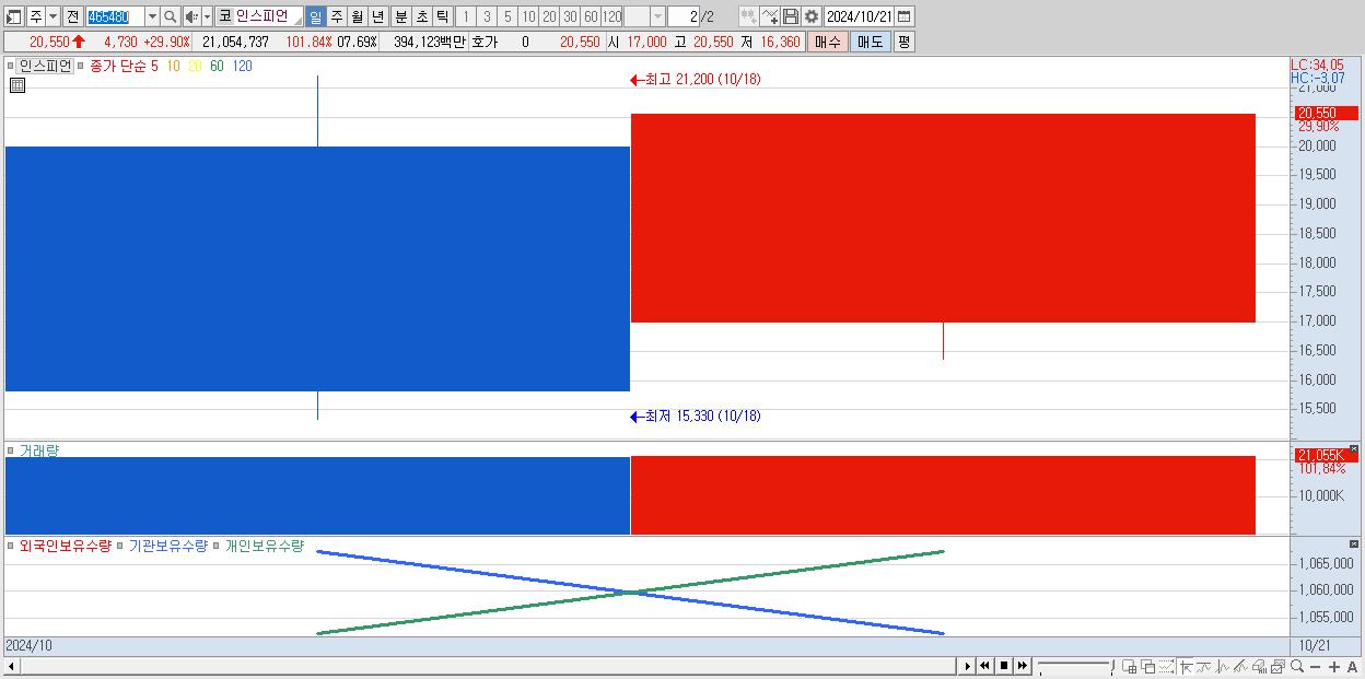 - 인스피언 (20,550원 ▲ 29.9% , 시총: 2,083억, 거래량: 21,054,737, 거래대금:3,941억)