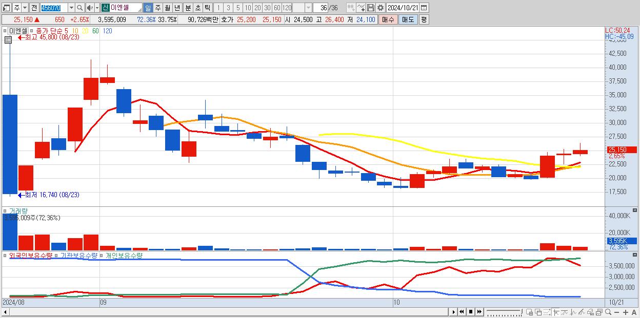 - 이엔셀 (25,150원 ▲ 2.65% , 시총: 2,679억, 거래량: 3,595,009, 거래대금:907억)
