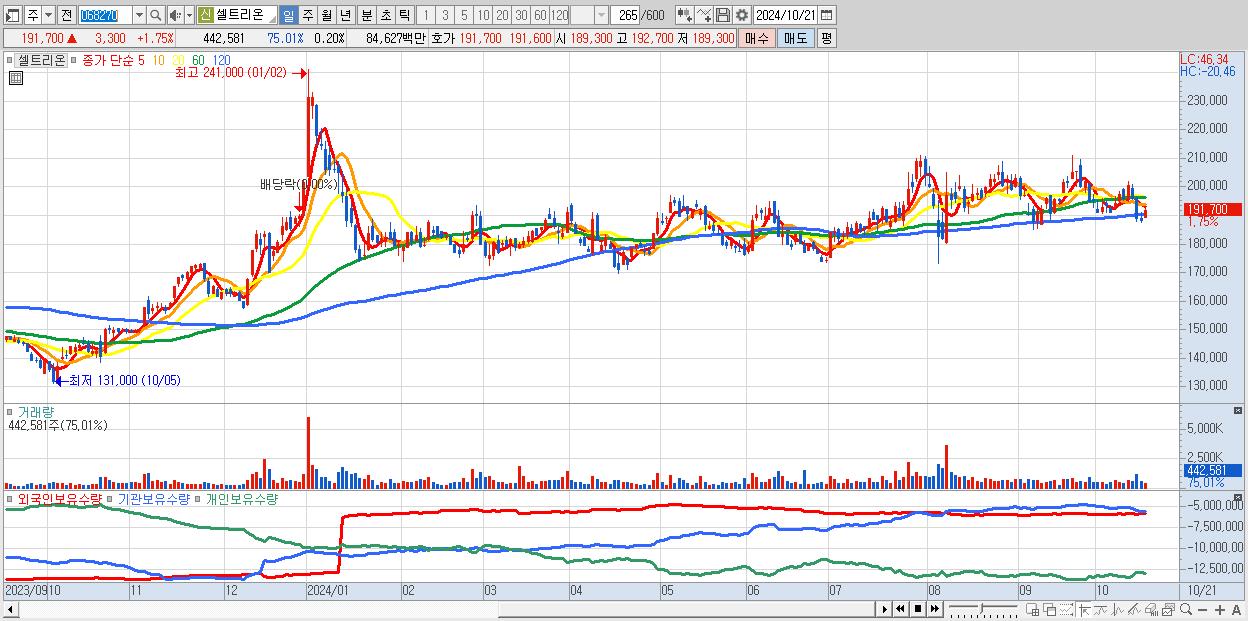 - 셀트리온 (191,700원 ▲ 1.75% , 시총: 416,030억, 거래량: 442,581, 거래대금:846억)