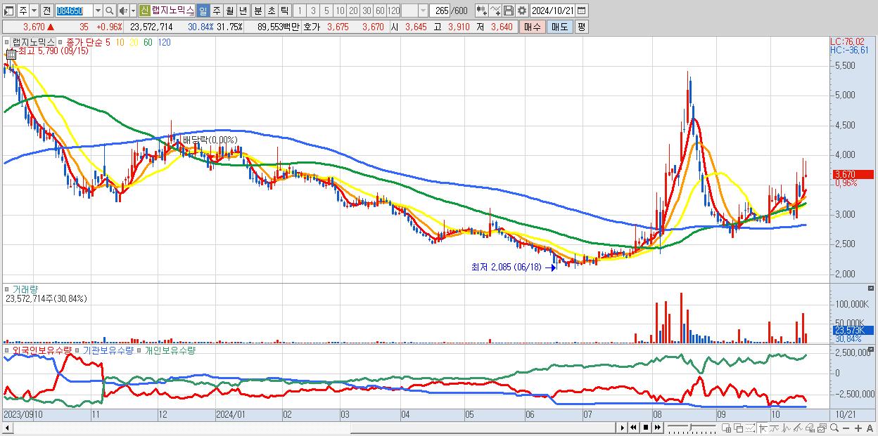 - 랩지노믹스 (3,670원 ▲ 0.96% , 시총: 2,725억, 거래량: 23,572,714, 거래대금:896억)