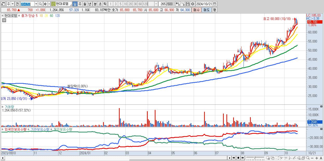- 현대로템 (65,700원 ▲ 1.08% , 시총: 71,706억, 거래량: 1,264,056, 거래대금:831억)