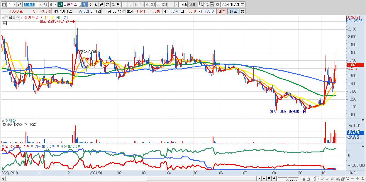 - 피델릭스 (1,640원 ▲ 3.21% , 시총: 543억, 거래량: 43,458,122, 거래대금:740억)