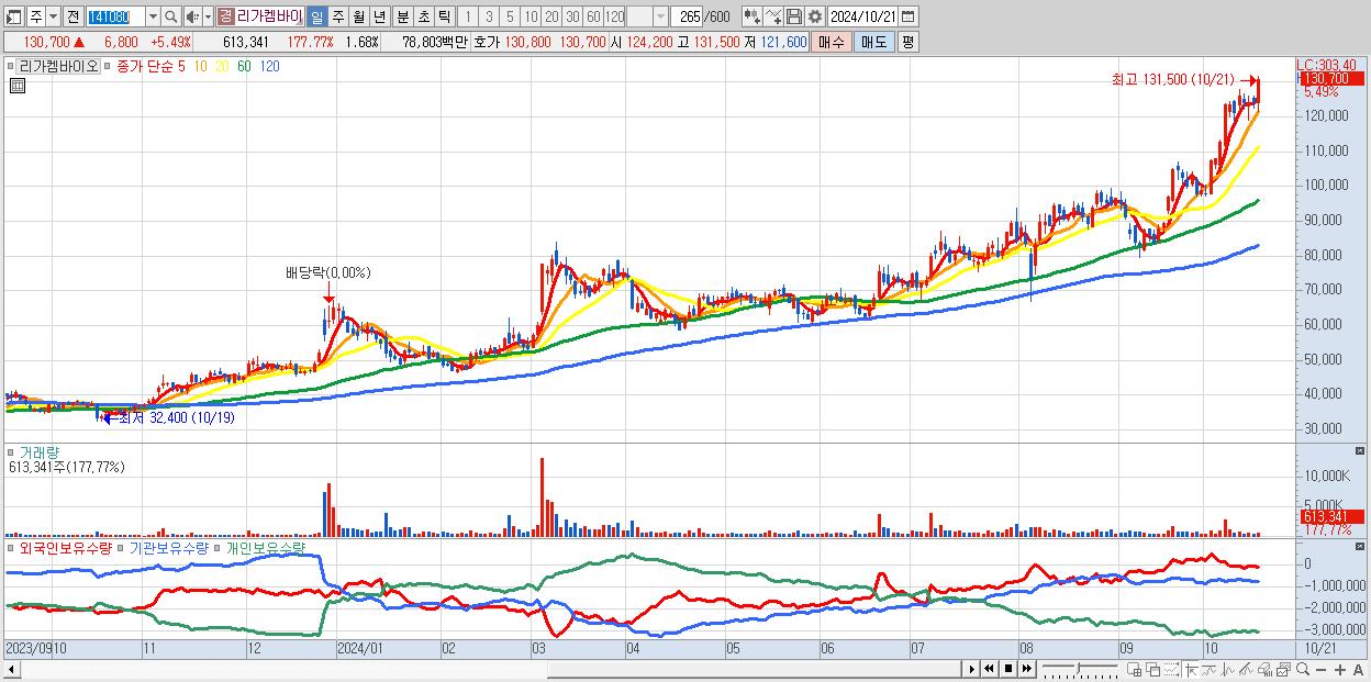 - 리가켐바이오 (130,700원 ▲ 5.49% , 시총: 47,794억, 거래량: 613,341, 거래대금:788억)