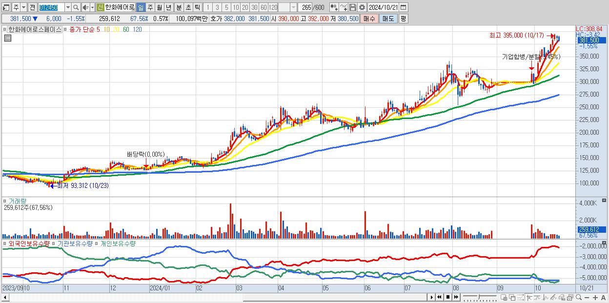 - 한화에어로스페이스 (381,500원 ▼ -1.55% , 시총: 173,892억, 거래량: 259,612, 거래대금:1,001억)
