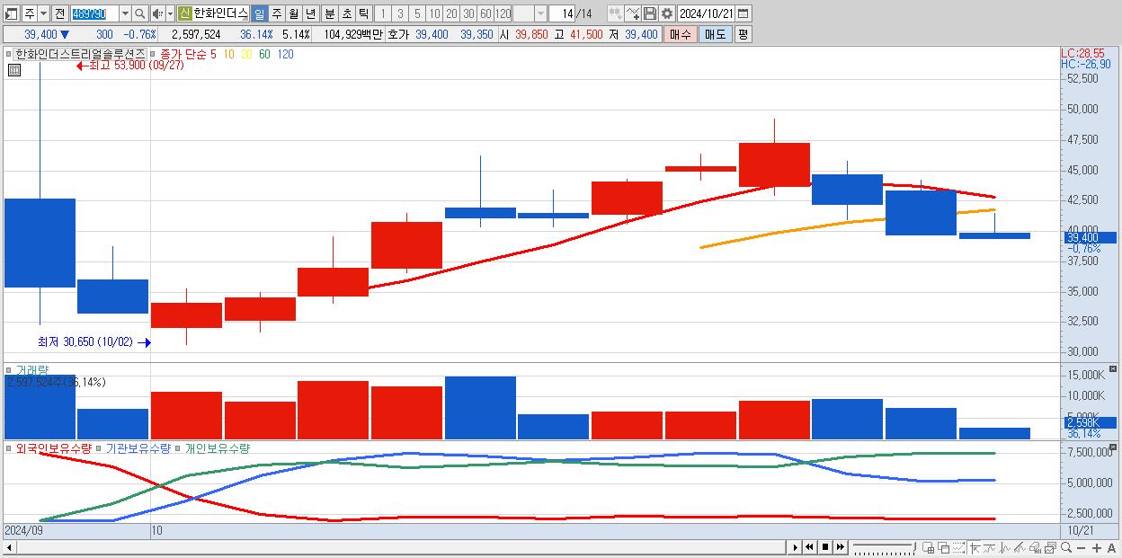 - 한화인더스트리얼솔루션즈 (39,400원 ▼ -0.76% , 시총: 19,892억, 거래량: 2,597,524, 거래대금:1,049억)