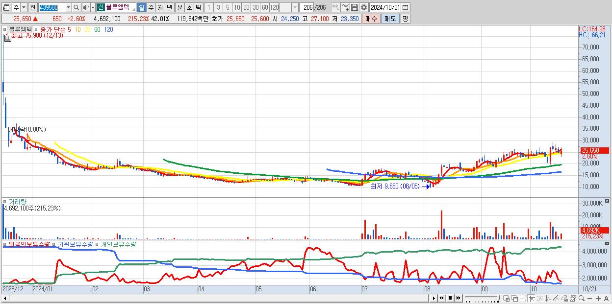 - 블루엠텍 (25,650원 ▲ 2.6% , 시총: 2,865억, 거래량: 4,692,100, 거래대금:1,198억)