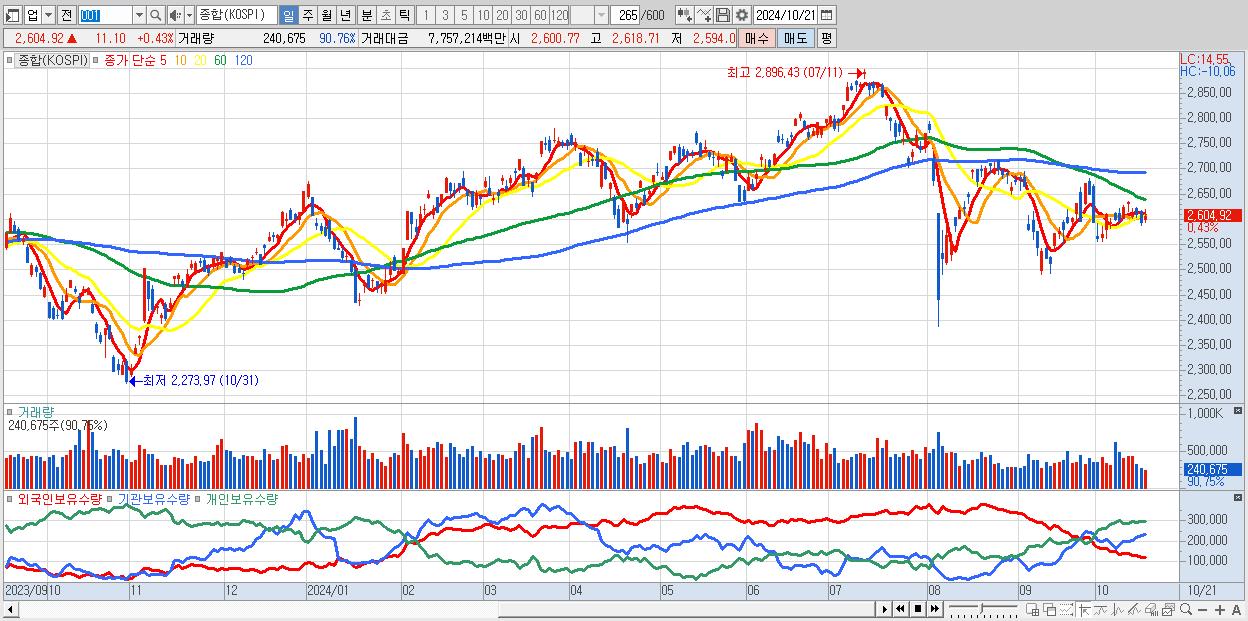 | 10/21 | 2,604.92 | ▲0.43% | -2,684억 | 187억 | 2,683억 | -186억 |