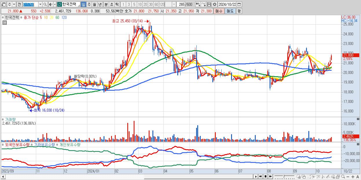- 한국전력 (21,800원 ▲ 2.59% , 시총: 139,948억, 외국인 순매수 거래금:50억)