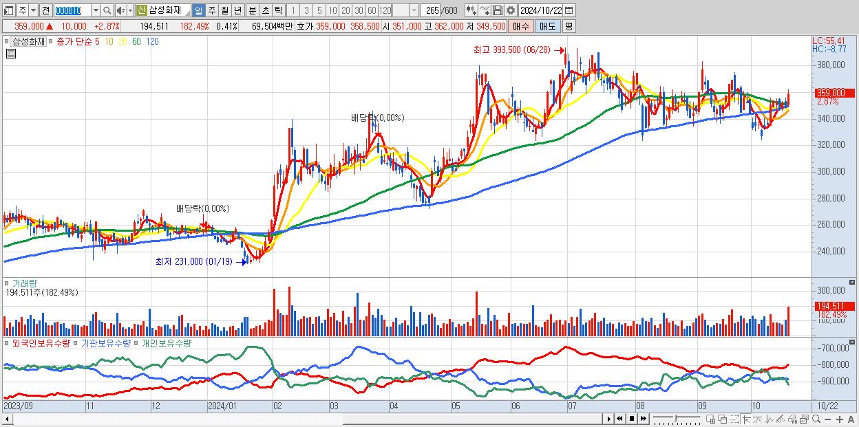 - 삼성화재 (359,000원 ▲ 2.87% , 시총: 170,076억, 외국인 순매수 거래금:116억)