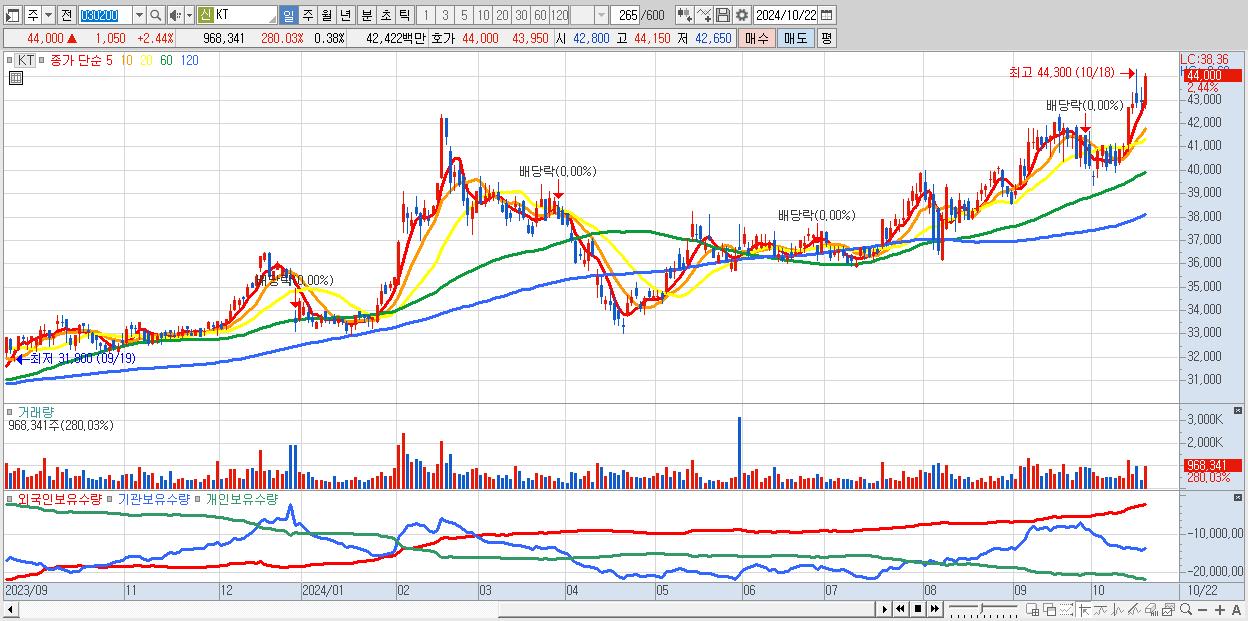 - KT (44,000원 ▲ 2.44% , 시총: 110,890억, 외국인 순매수 거래금:131억)