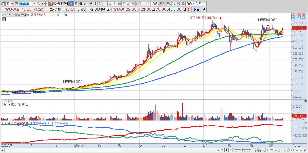 1.HD현대일렉트릭 329,500원 ▲ 3.29% (KOSPI, 267260)