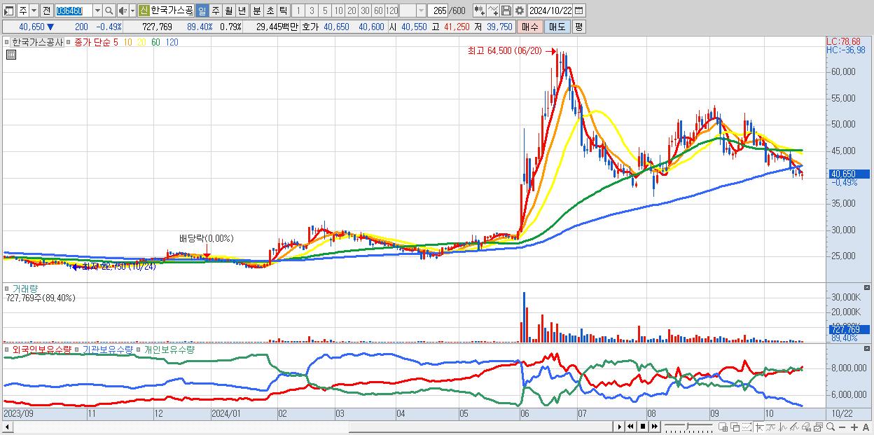 - 한국가스공사 (40,650원 ▼ -0.49% , 시총: 37,525억, 외국인 순매수 거래금:85억)