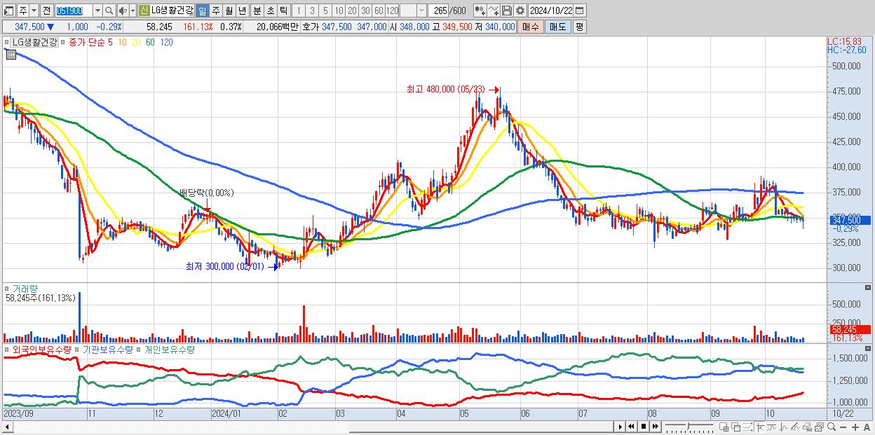 - LG생활건강 (347,500원 ▼ -0.29% , 시총: 54,273억, 외국인 순매수 거래금:75억)