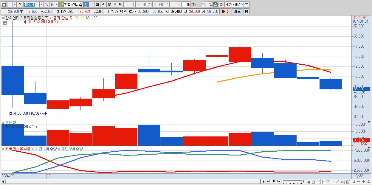 29.한화인더스트리얼솔루션즈 36,900원 ▼ -6.35% (KOSPI, 489790)