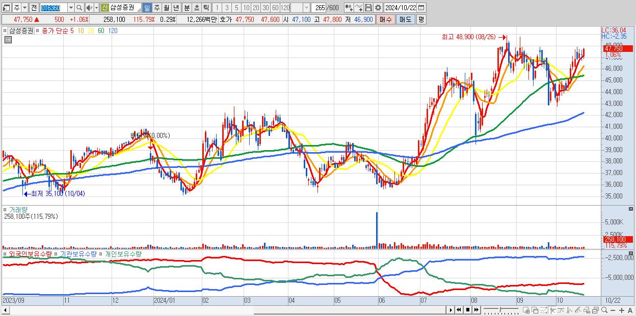 - 삼성증권 (47,750원 ▲ 1.06% , 시총: 42,641억, 외국인 순매수 거래금:45억)
