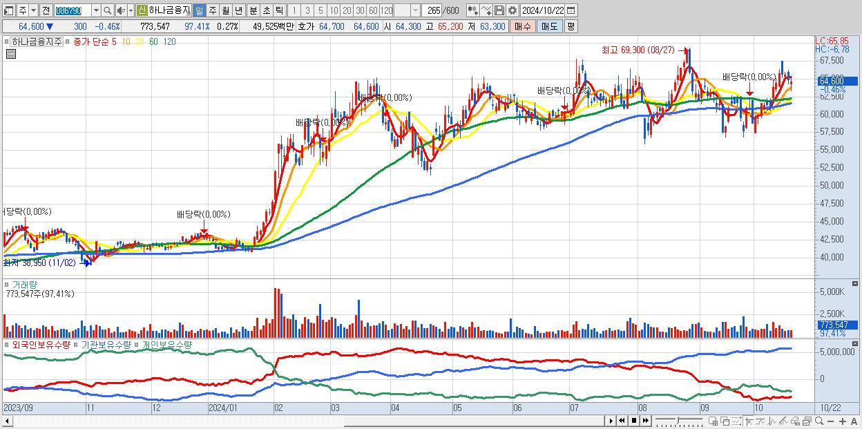 - 하나금융지주 (64,600원 ▼ -0.46% , 시총: 185,558억, 외국인 순매수 거래금:46억)