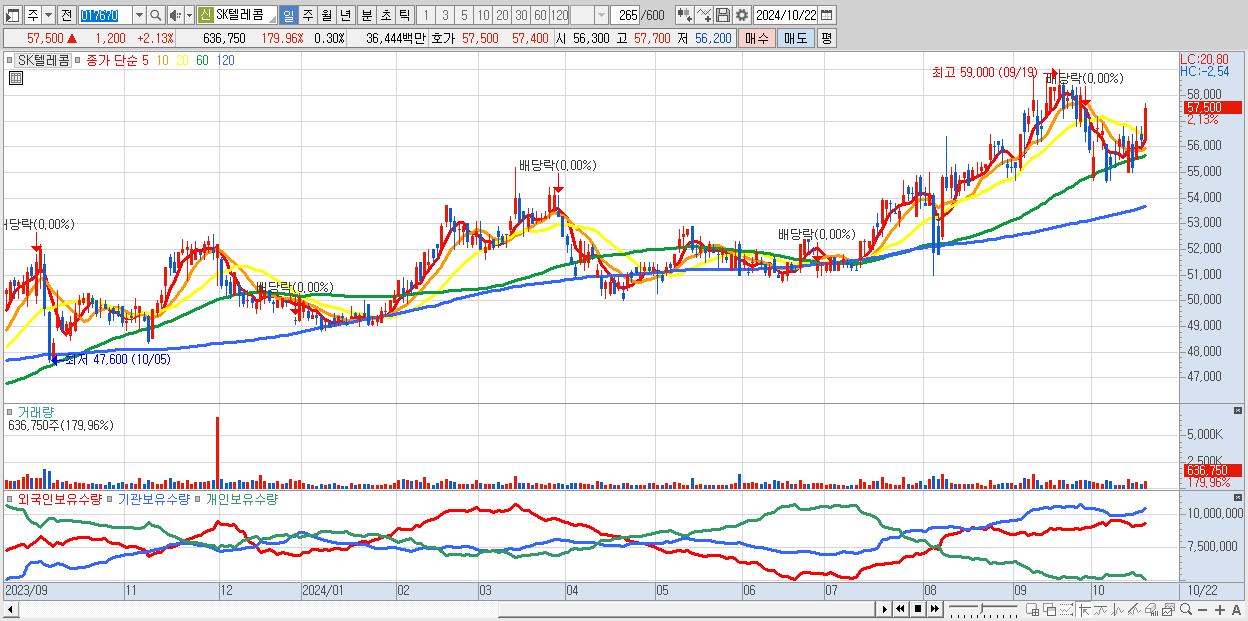 - SK텔레콤 (57,500원 ▲ 2.13% , 시총: 123,504억, 외국인 순매수 거래금:70억)