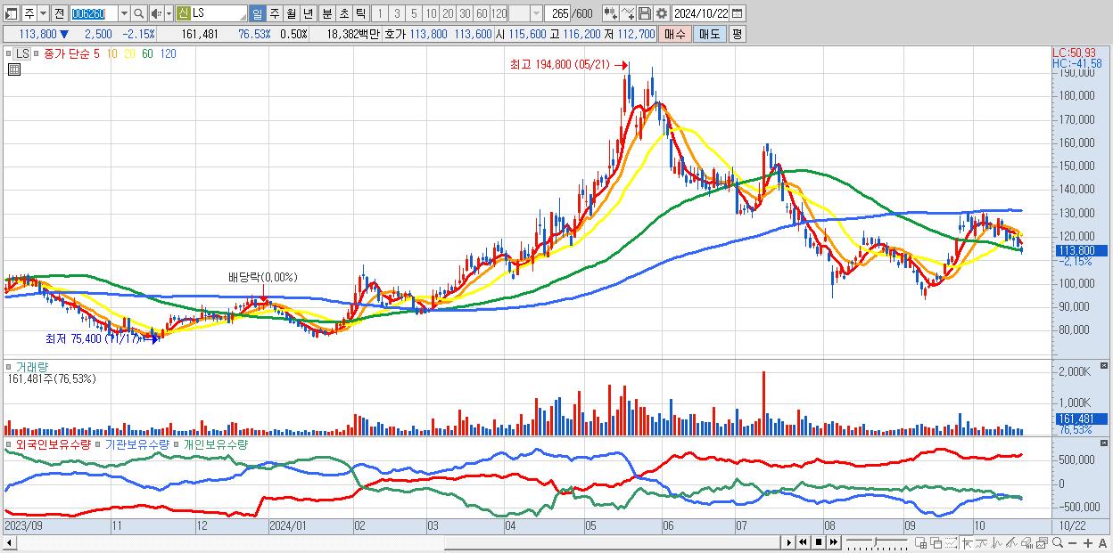 - LS (113,800원 ▼ -2.15% , 시총: 36,644억, 외국인 순매수 거래금:71억)