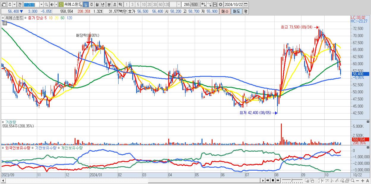 - 씨에스윈드 (56,400원 ▼ -5.05% , 시총: 23,785억, 외국인 순매수 거래금:80억)