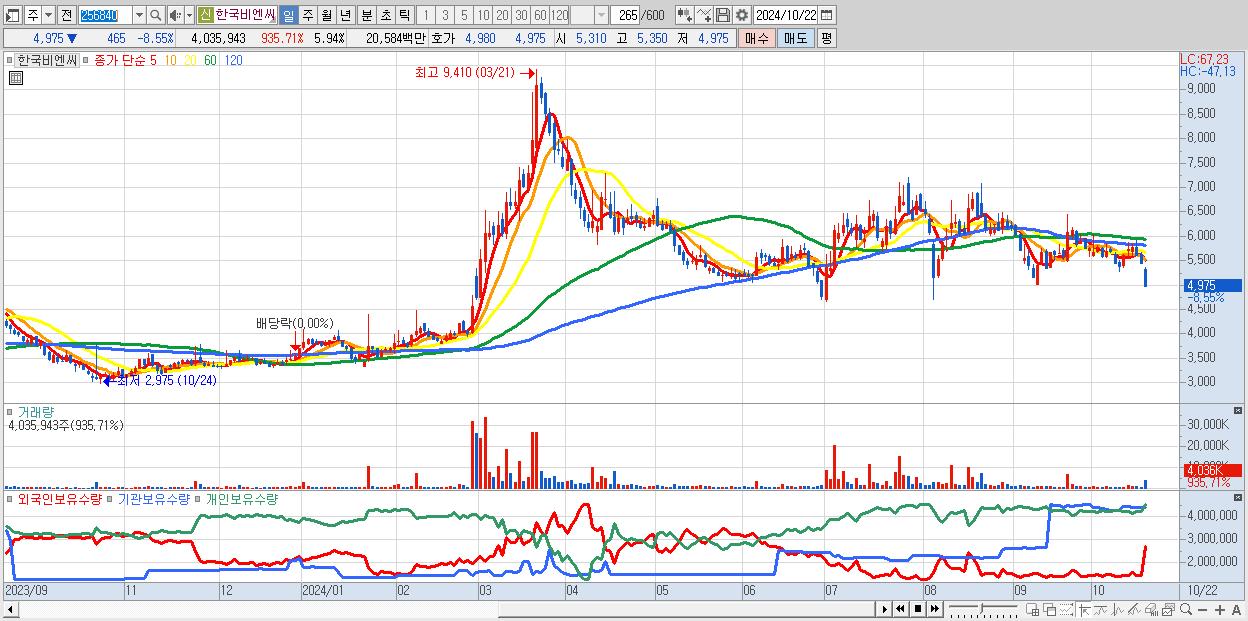 - 한국비엔씨 (4,975원 ▼ -8.55% , 시총: 3,379억, 외국인 순매수 거래금:51억)
