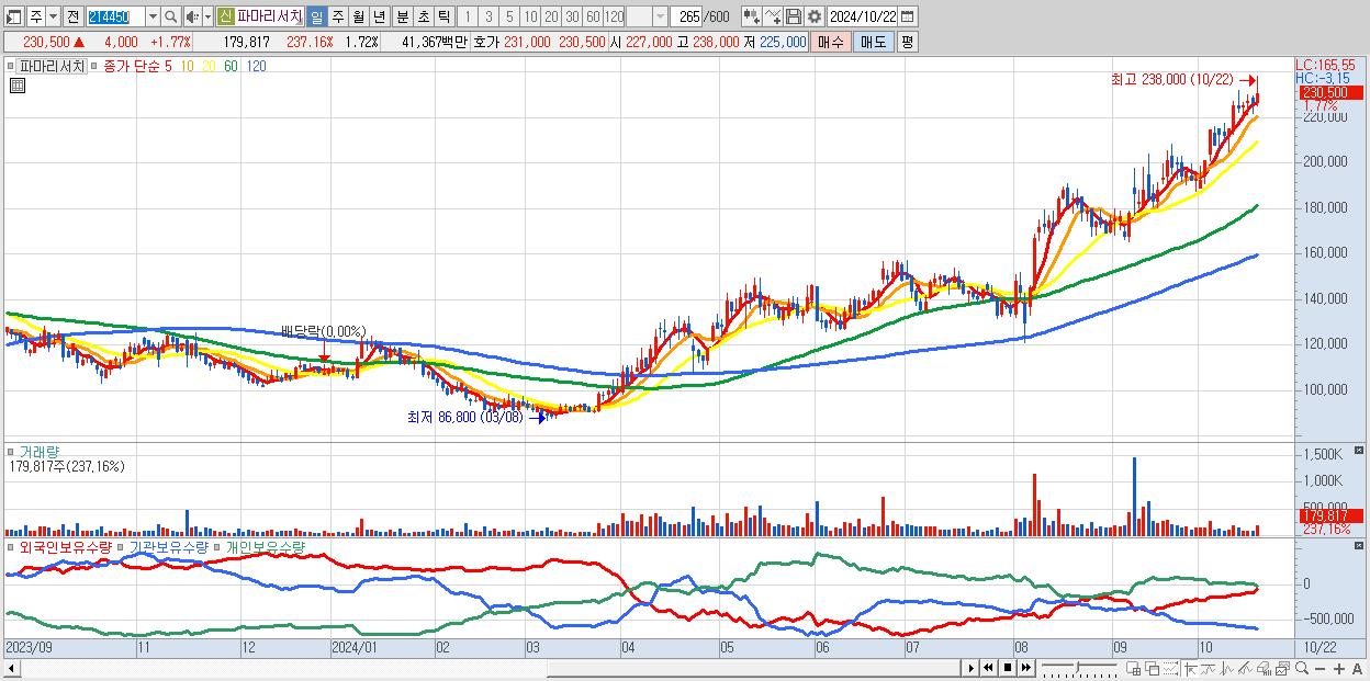 - 파마리서치 (230,500원 ▲ 1.77% , 시총: 24,120억, 외국인 순매수 거래금:90억)
