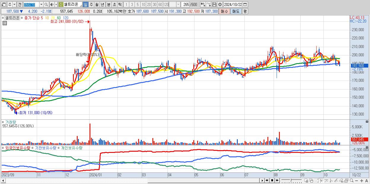 - 셀트리온 (187,500원 ▼ -2.19% , 시총: 406,915억, 외국인 순매수 거래금:50억)