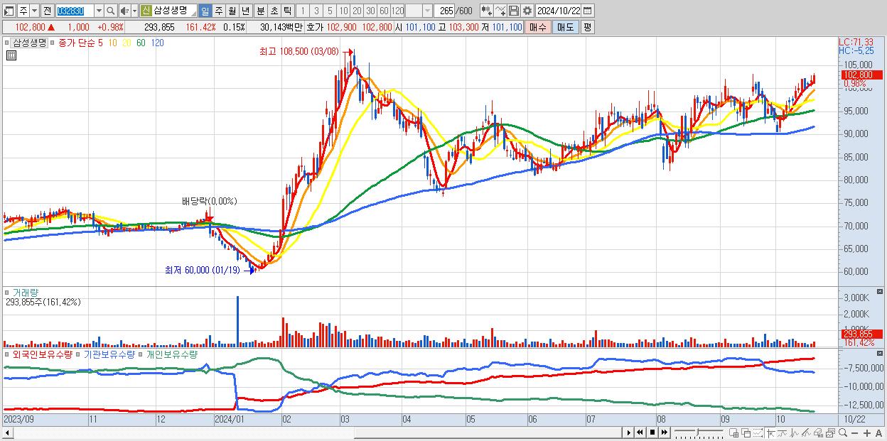 - 삼성생명 (102,800원 ▲ 0.98% , 시총: 205,600억, 외국인 순매수 거래금:126억)
