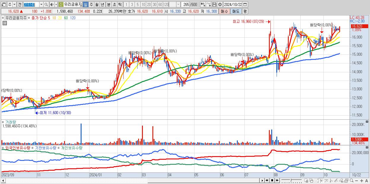 - 우리금융지주 (16,620원 ▲ 1.09% , 시총: 123,419억, 외국인 순매수 거래금:78억)