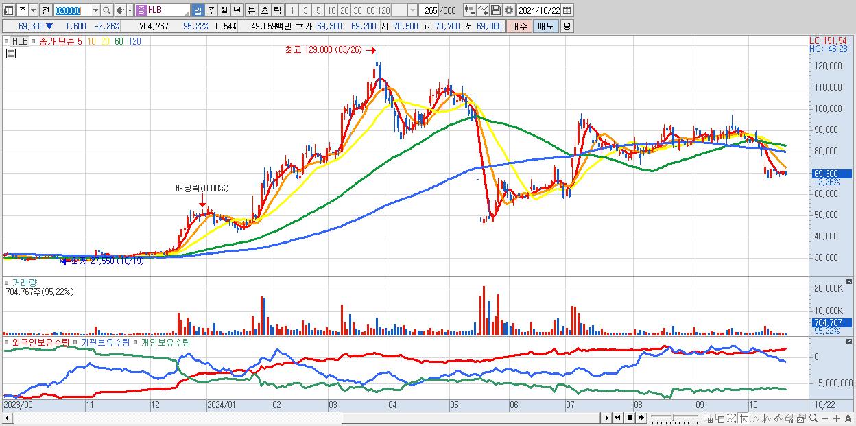 - HLB (69,300원 ▼ -2.26% , 시총: 90,871억, 외국인 순매수 거래금:59억)