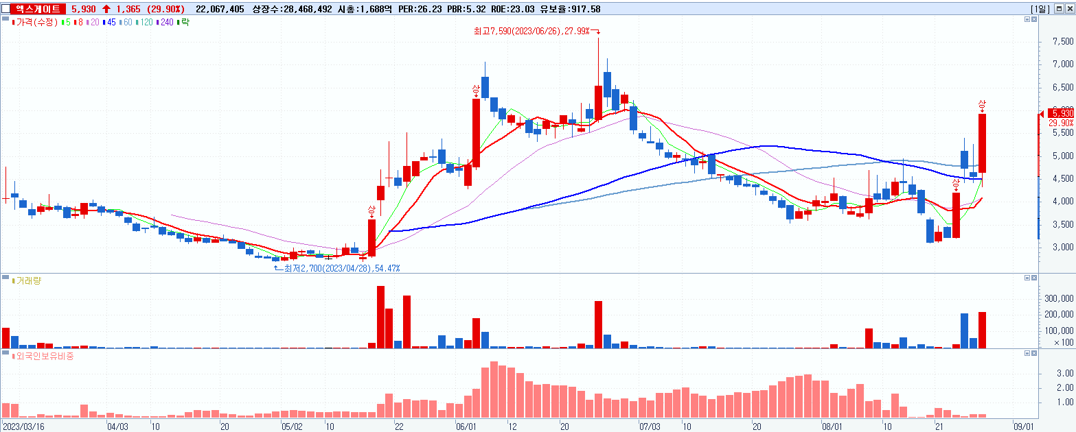 - 엑스게이트 (5,930원 ▲ 29.9% , 시총: 1,688억, 거래량: 22,172,104, 거래대금:1,179억)