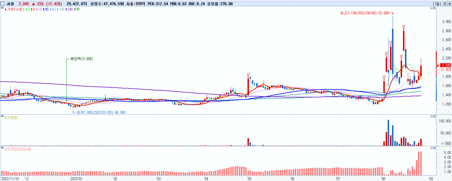 - 서원 (2,045원 ▲ 12.42% , 시총: 971억, 거래량: 29,427,067, 거래대금:605억)