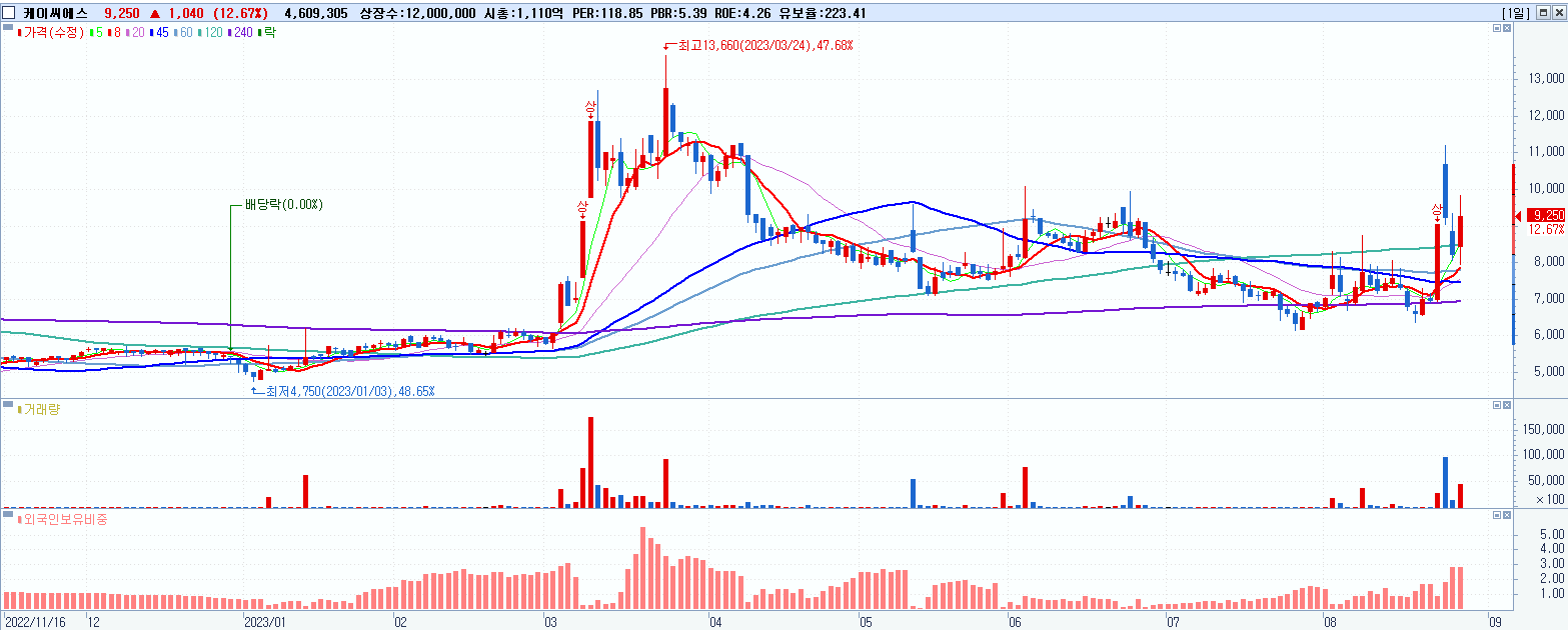 - 케이씨에스 (9,250원 ▲ 12.67% , 시총: 1,110억, 거래량: 4,620,161, 거래대금:418억)
